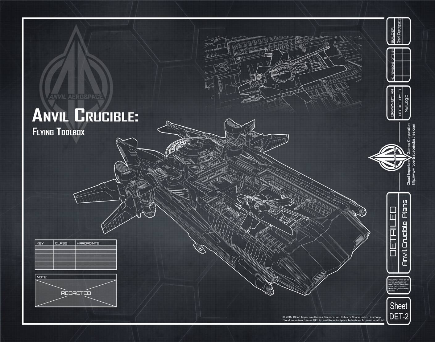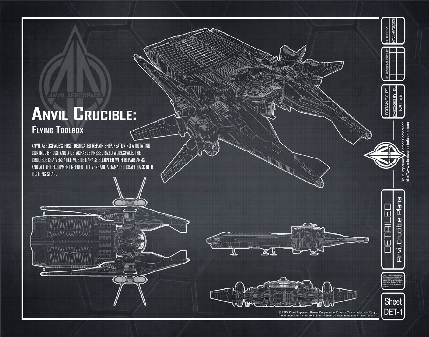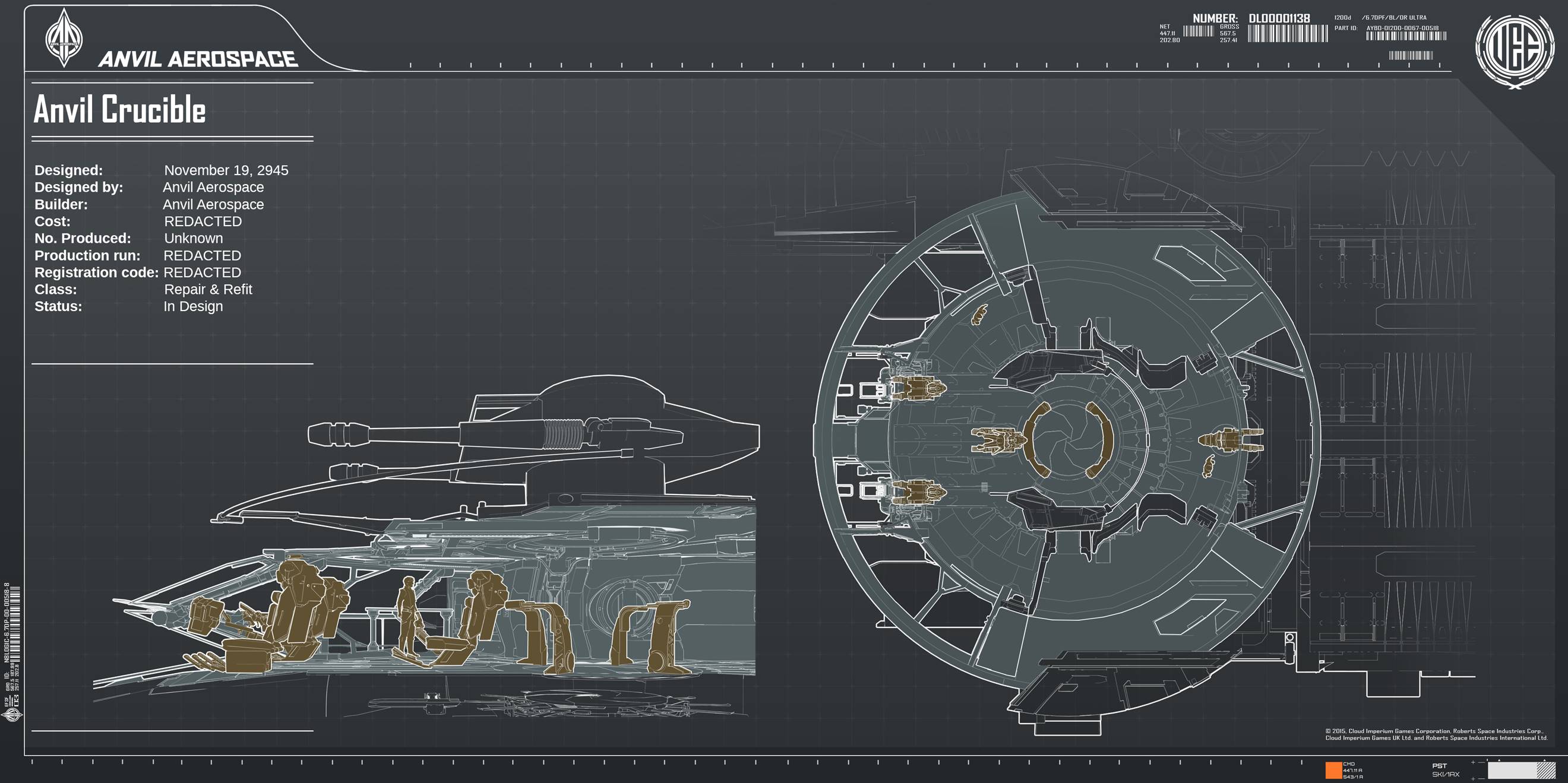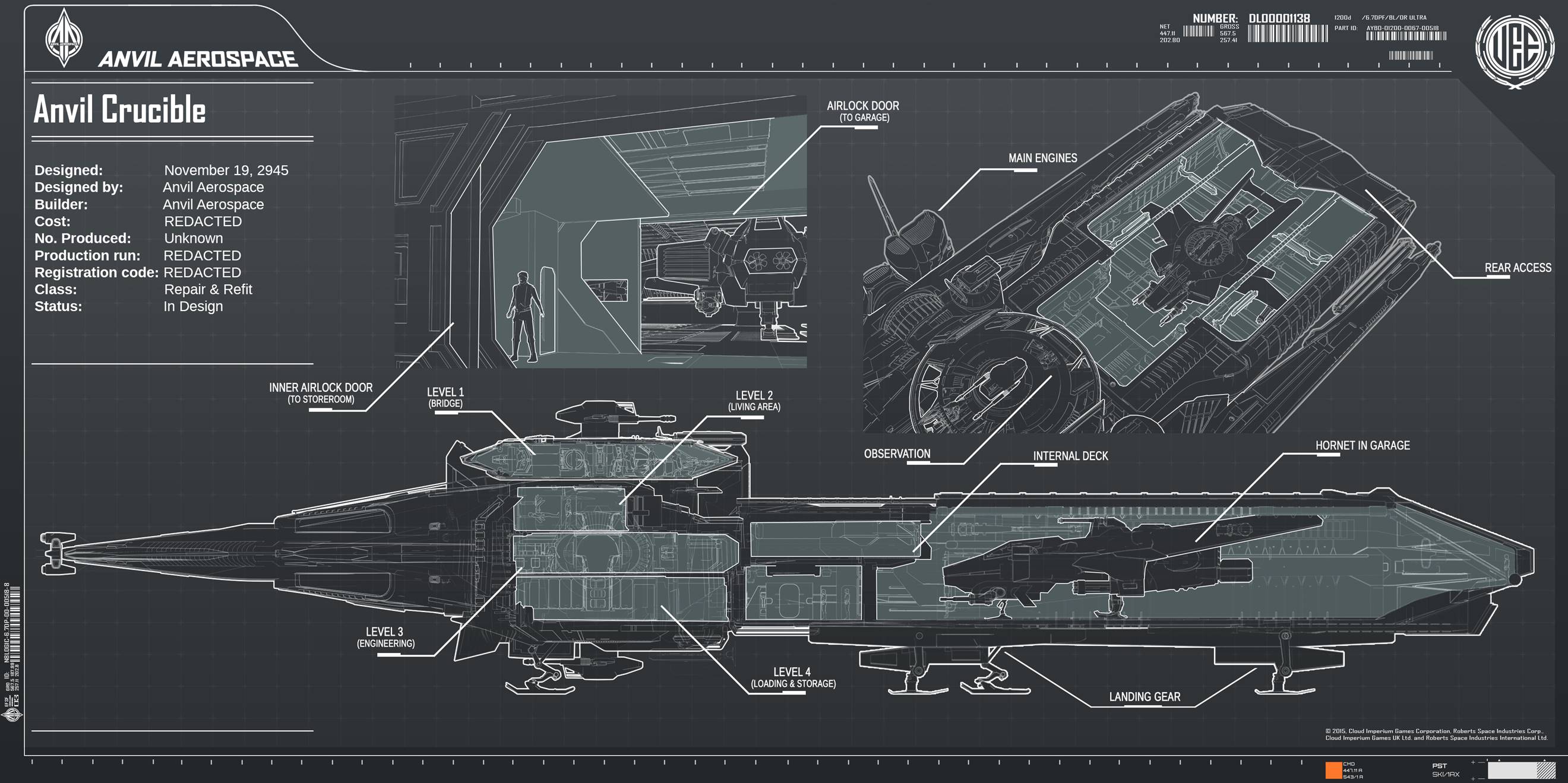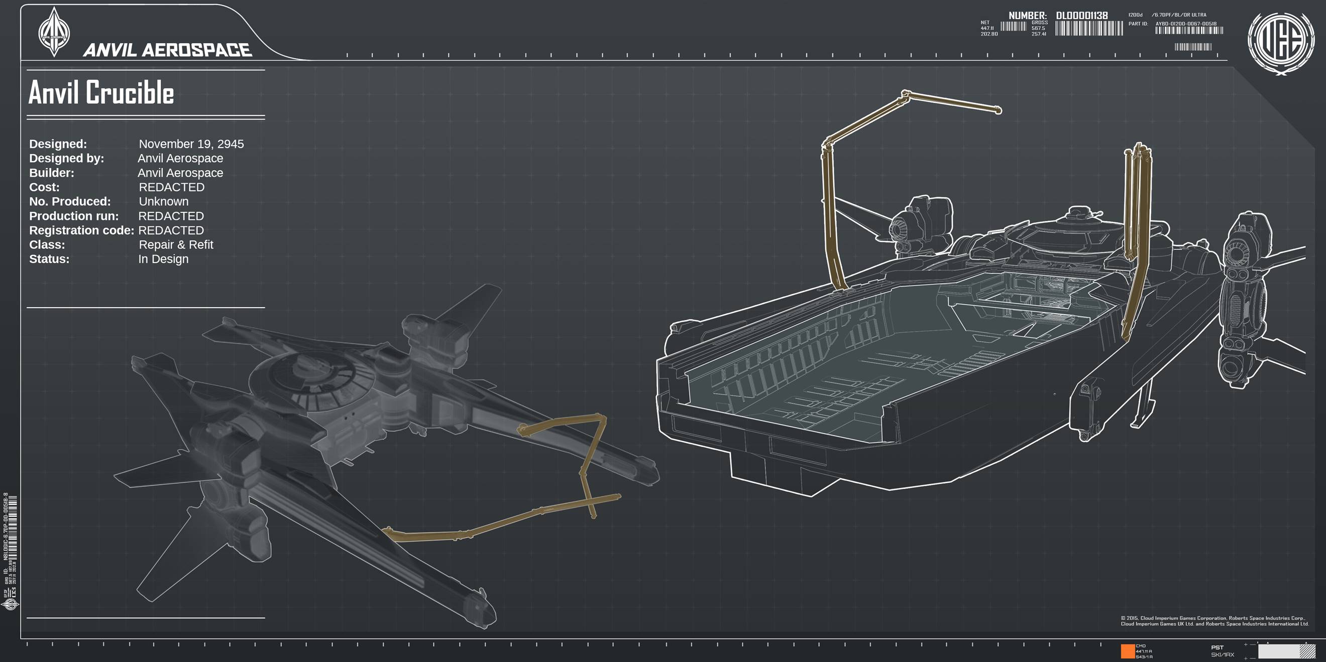 A so-called “flying toolbox,” the Crucible is Anvil Aerospace’s first dedicated repair ship. Featuring a rotating control bridge and a detachable pressurized workspace, the Crucible is a versatile mobile garage equipped with repair arms, a drone operation center and all the equipment needed to overhaul a damaged craft back into fighting shape.