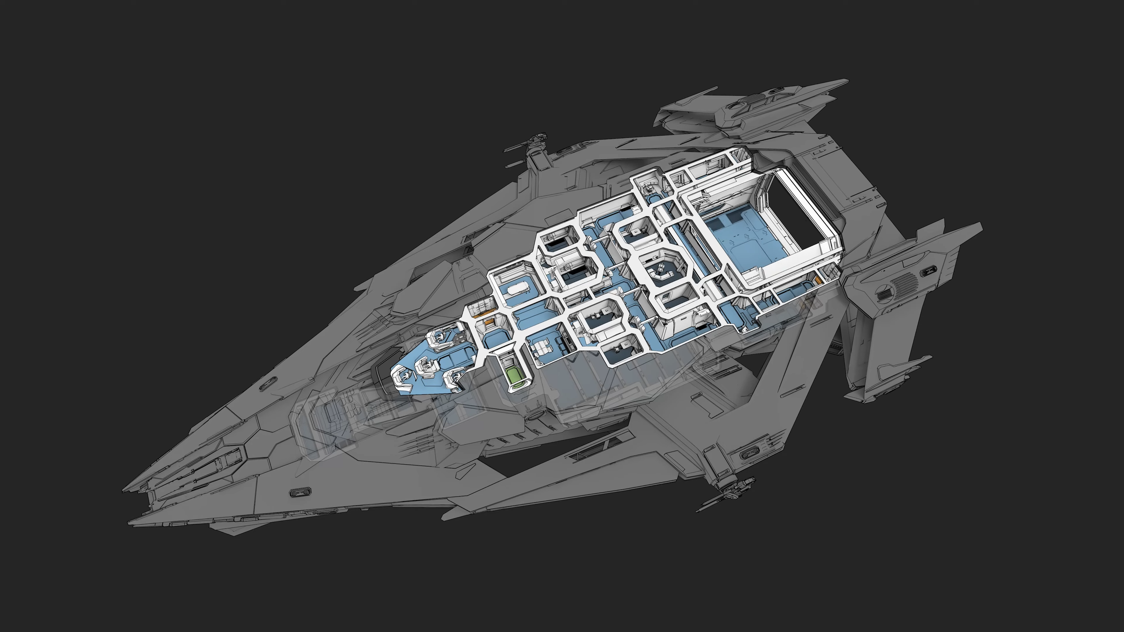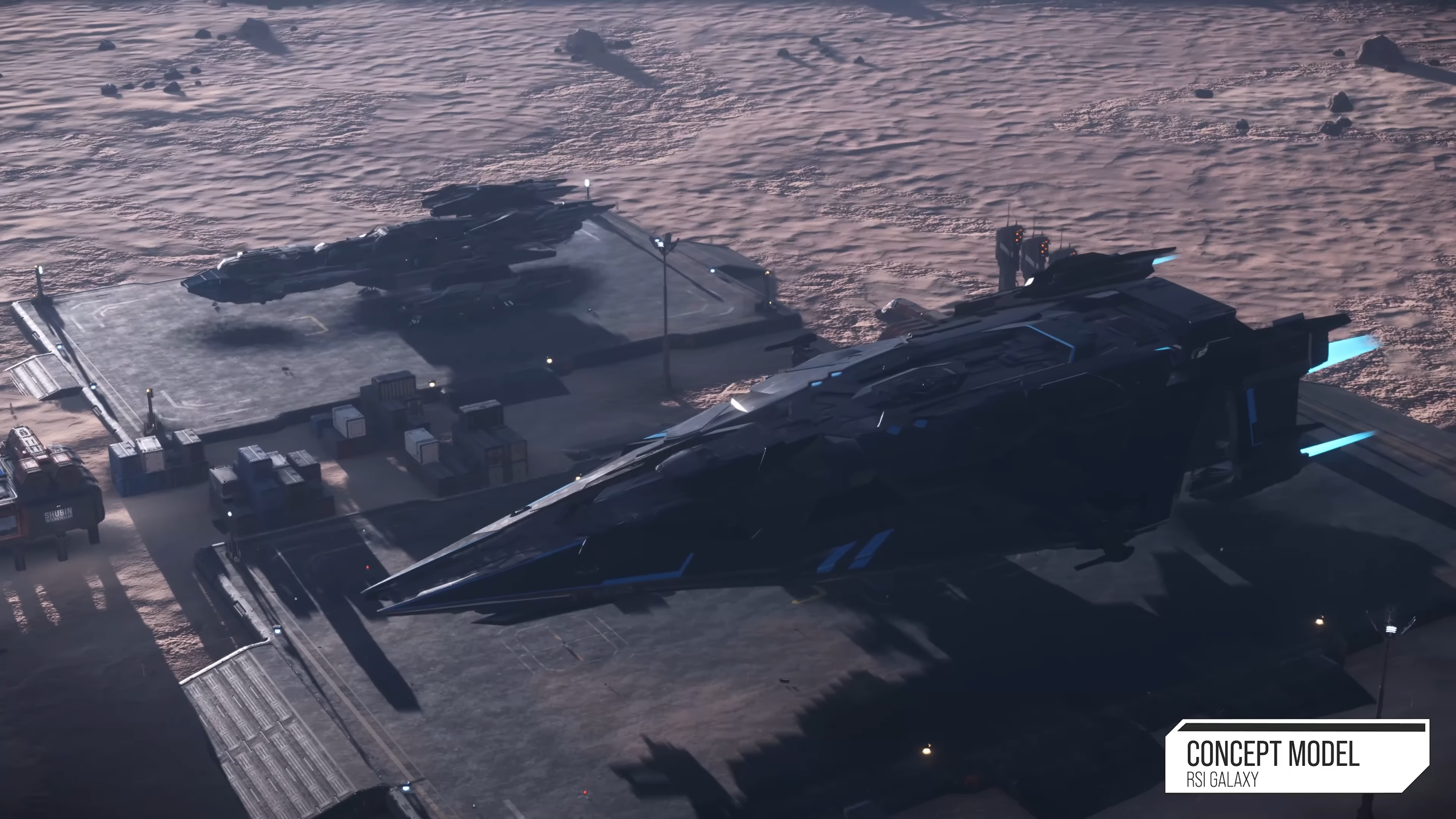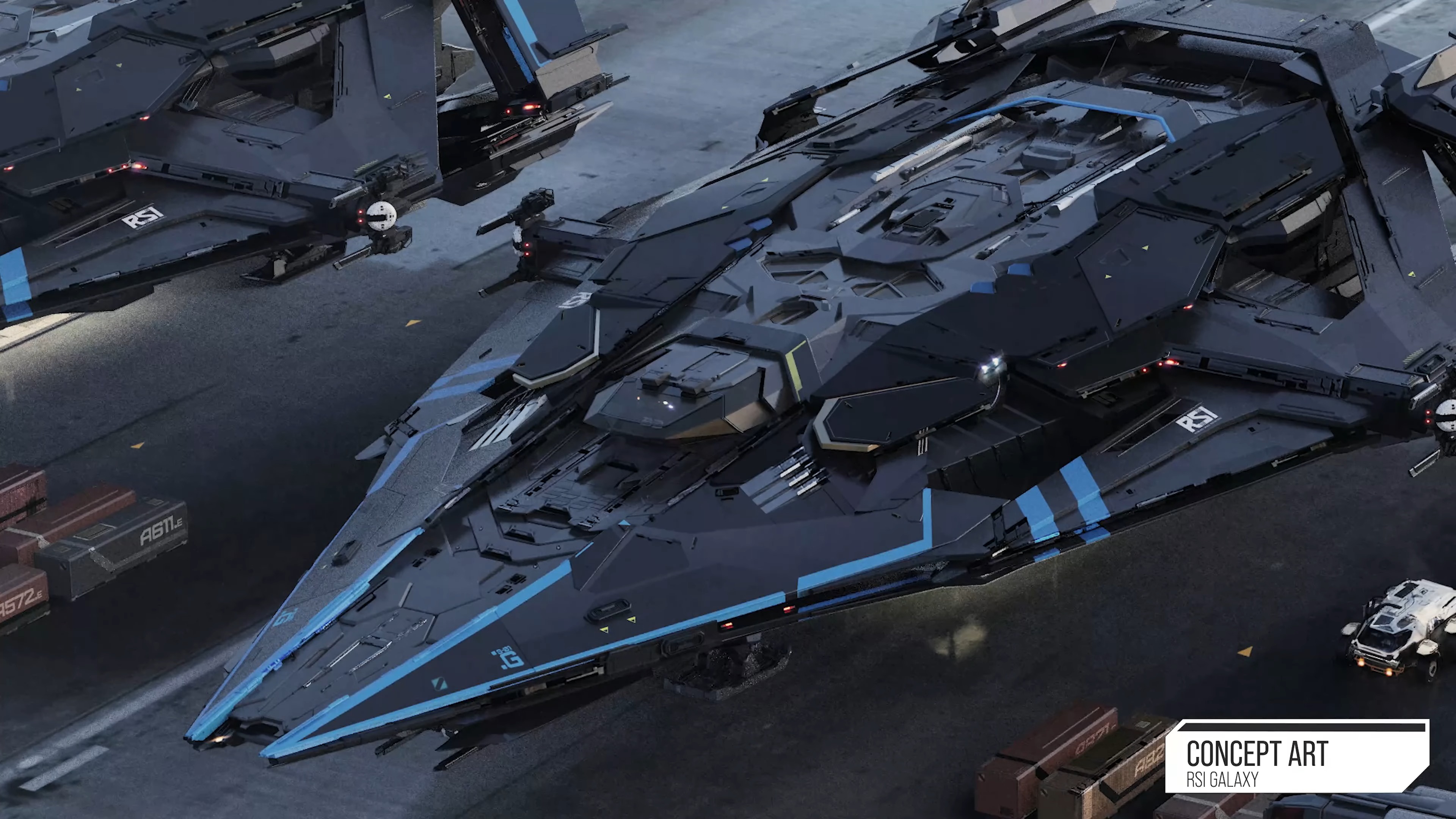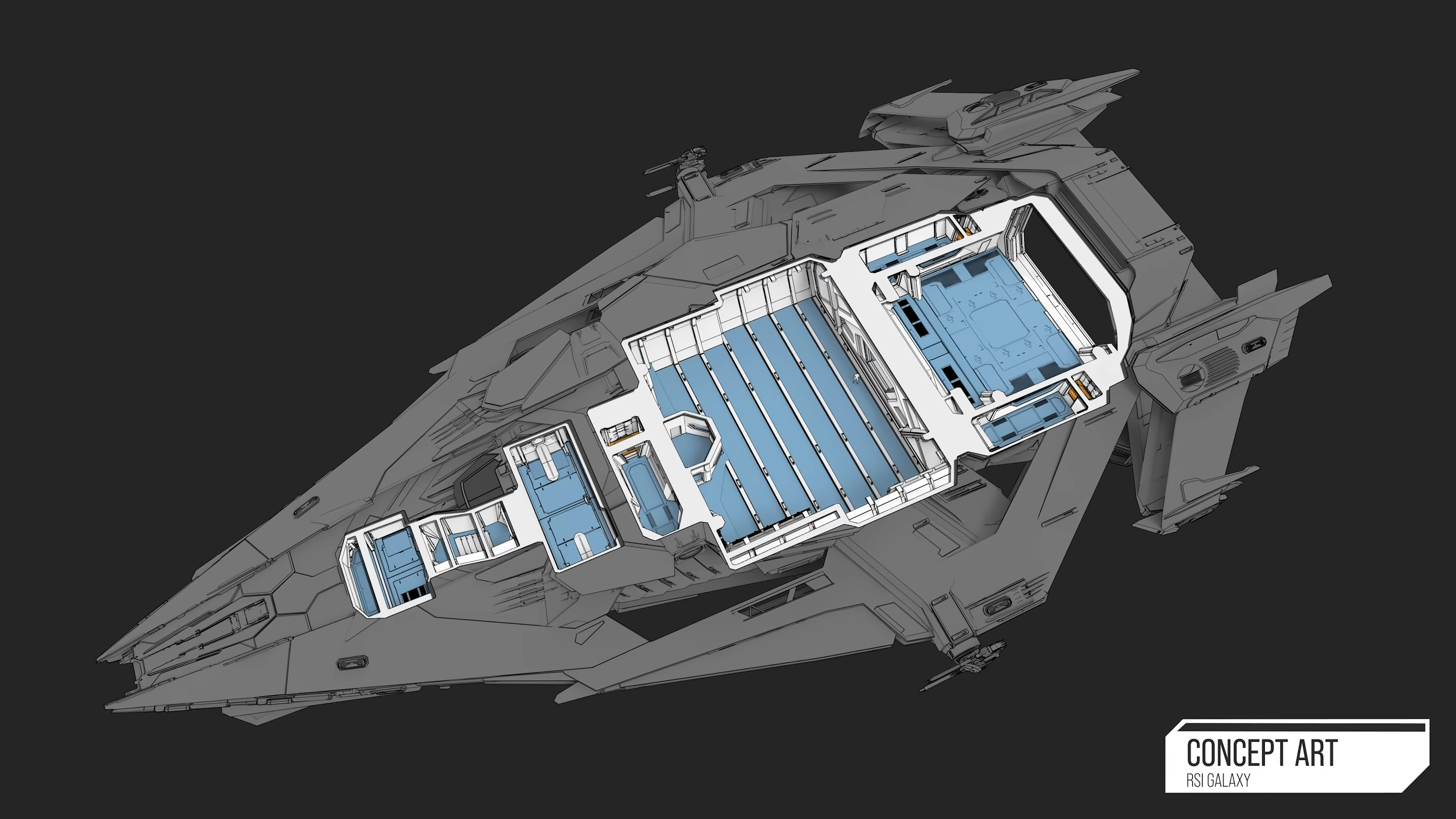 Featuring a fully modular design and an onboard hangar capable of deploying small ships, the cutting-edge Galaxy has versatility built into its DNA with a highly configurable main deck that can be outfitted with comprehensive facilities to support cargo, medical, or refining operations.