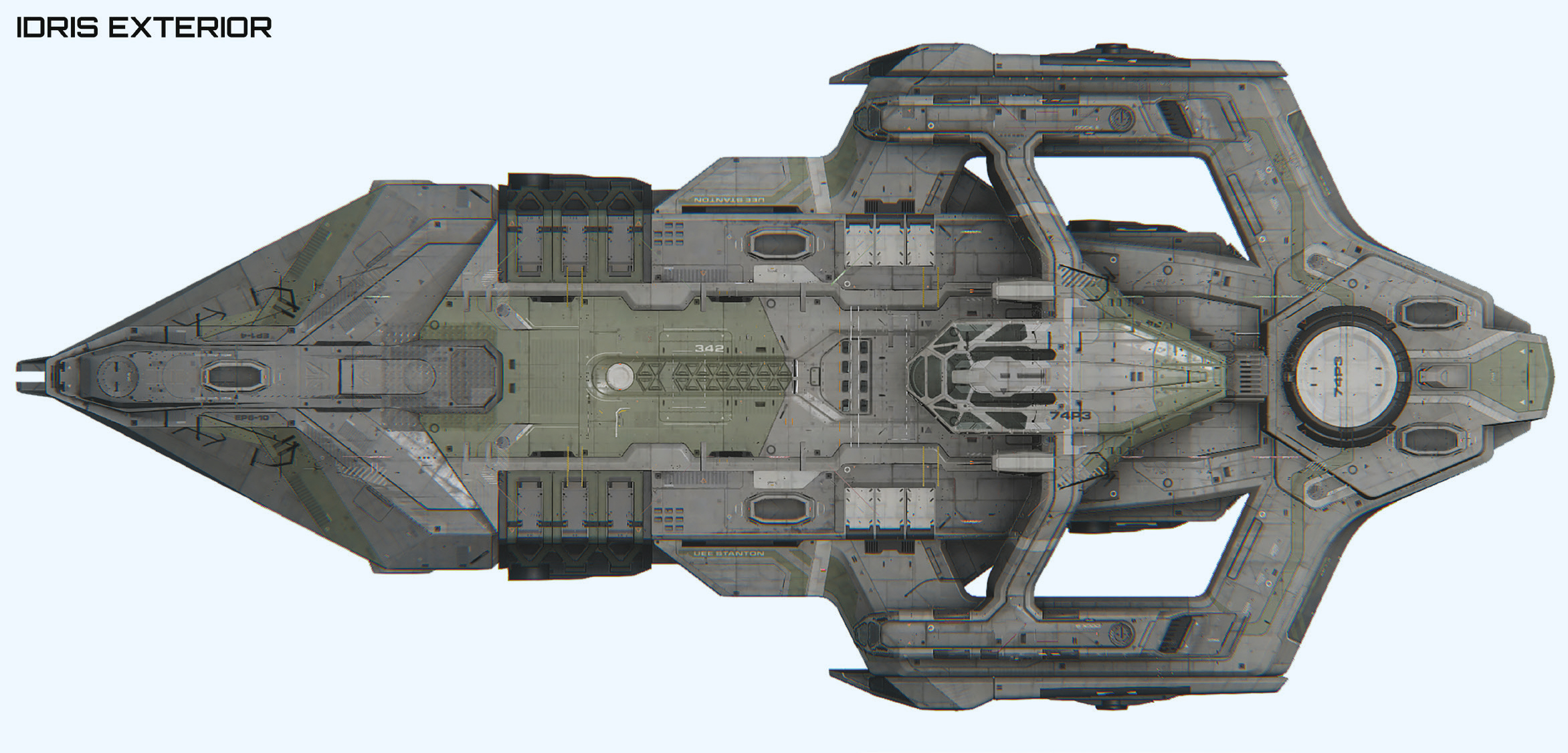 A mark two 'peacekeeper' variant developed for the UEE patrol services, the Idris-P strips the standard ship's ship-to-ship gun and spinal mount in favor of additional cargo capacity and superior speed.