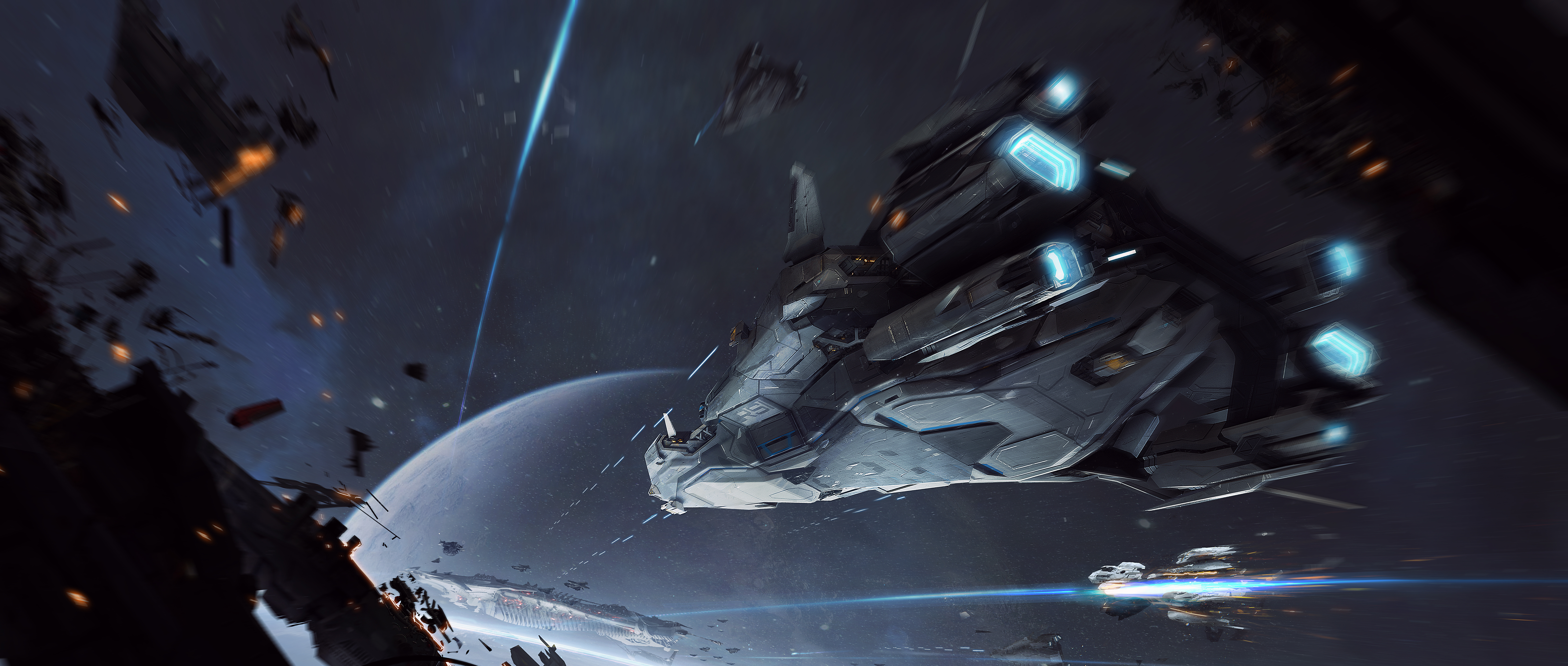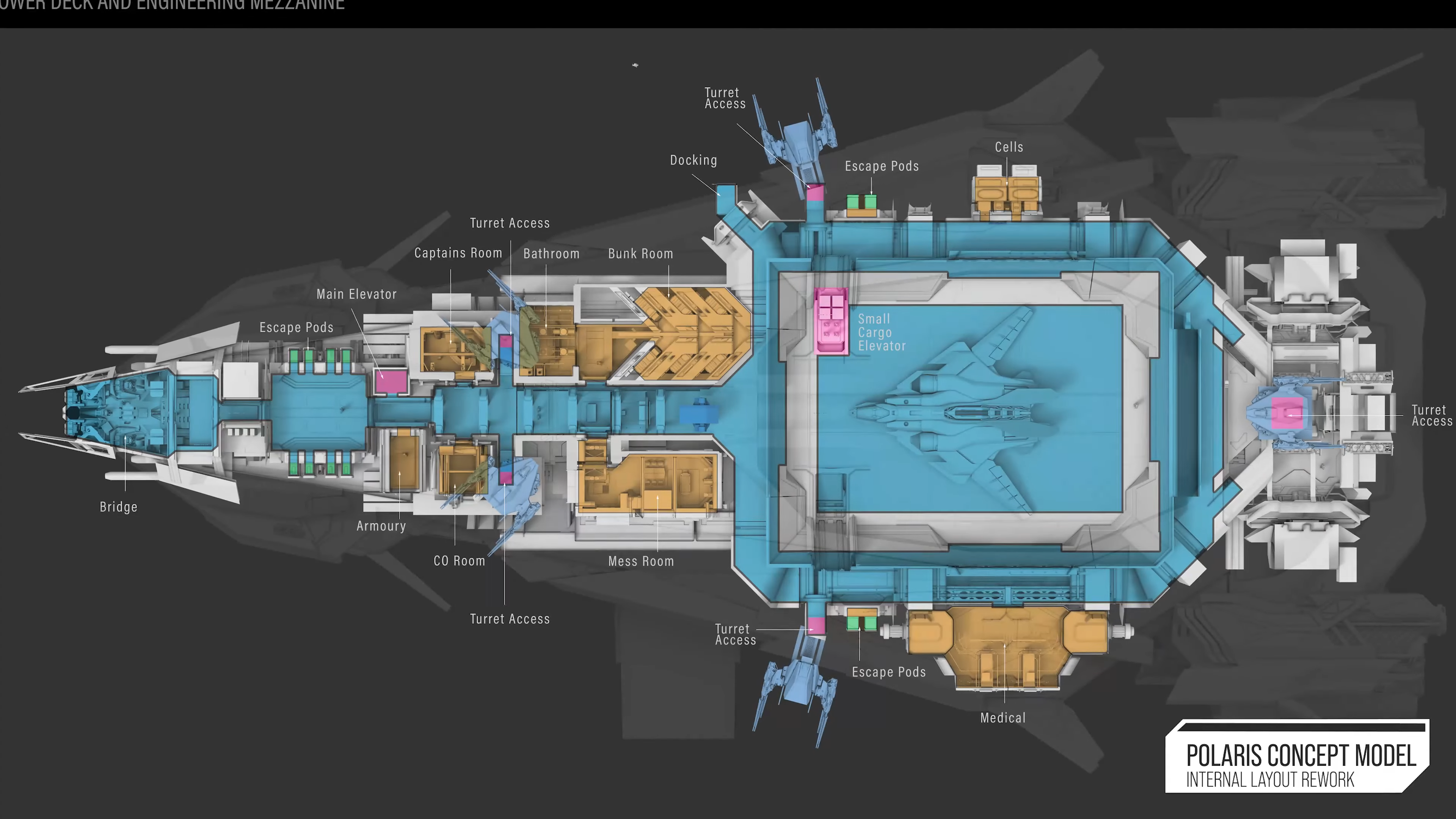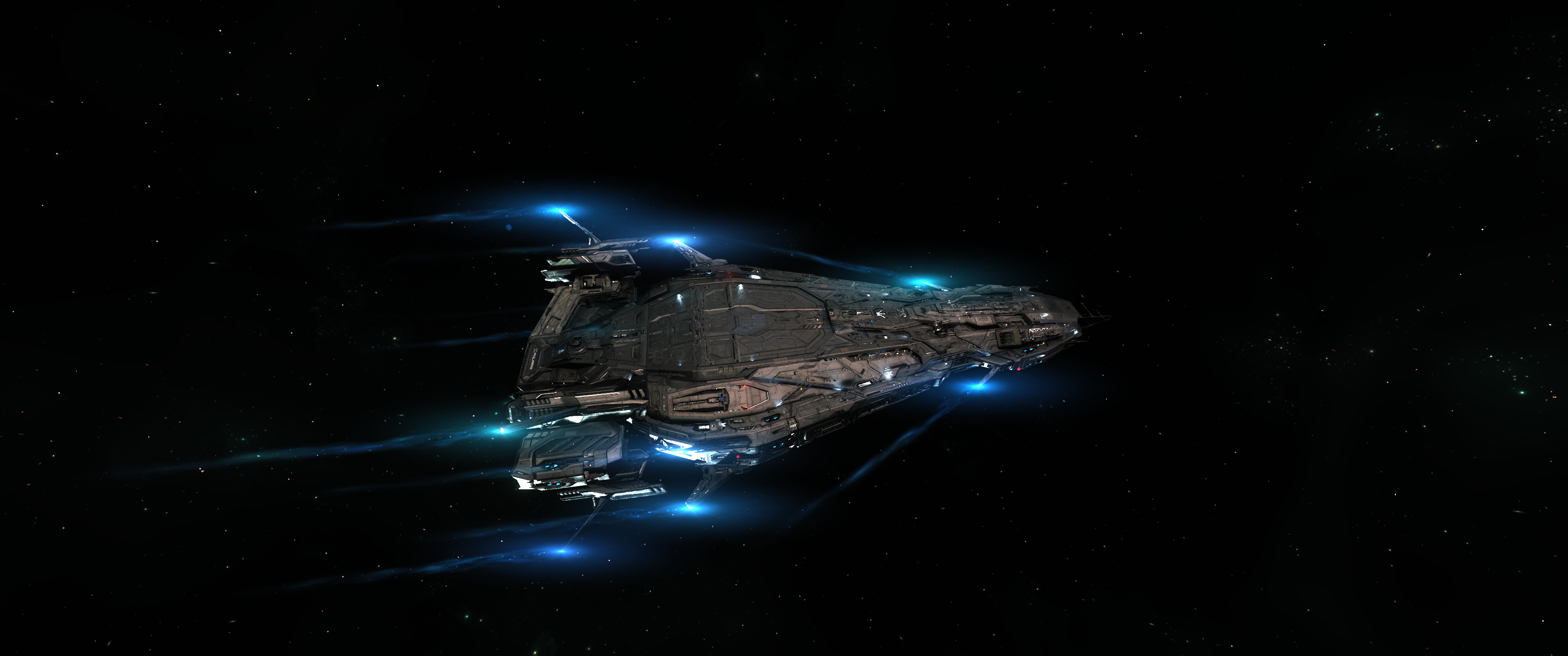 Nimble corvette-class capital ship packing a powerful punch with a full armament of turrets and torpedoes, small craft hangar, and habitation for a crew of 12.